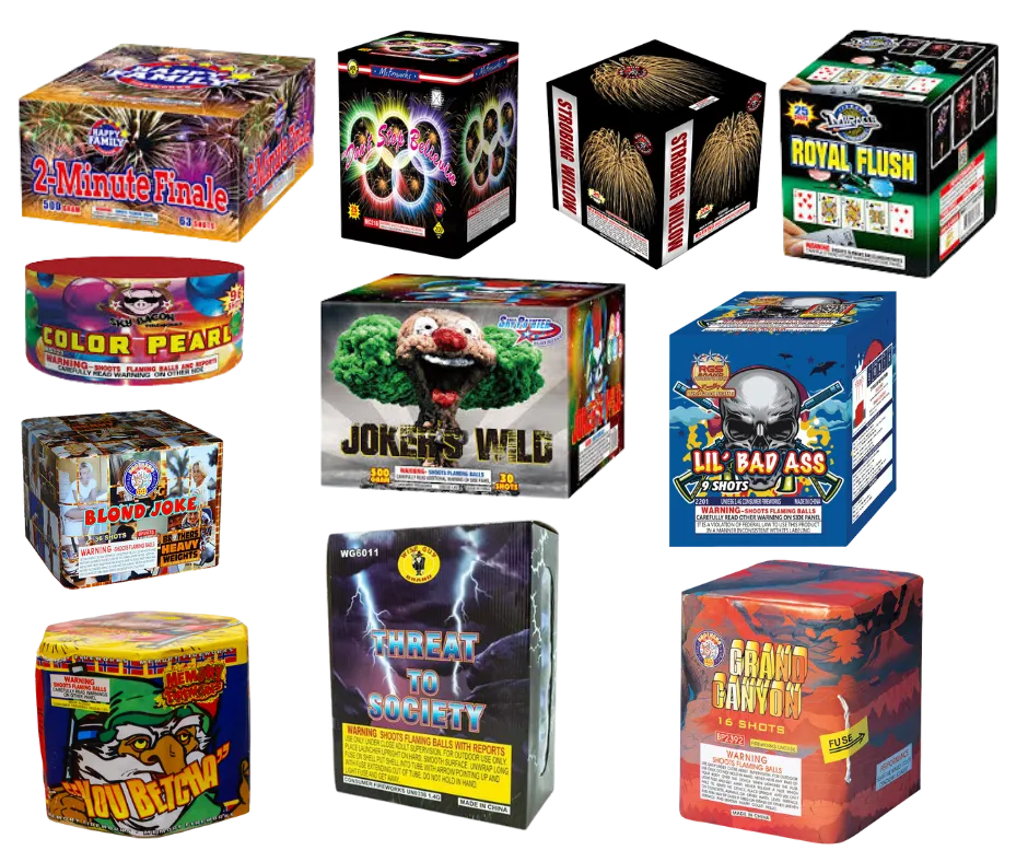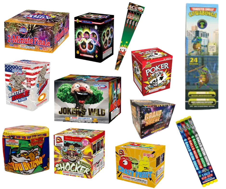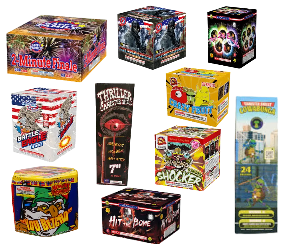 Cowabunga 24pk Artillery, Thriller Cans 7" 24pk Artillery, Masters 6" 24pk Artillery, Hit the Bone 500gr, Winning Colors 500gr, 1,000 HP 500gr 9 Rack, Nature Boy 500gr, Melee 500gr, Ride For The Brand 500gr, Loaded Cannon 500gr, 2 Min Finale 500gr, Engulfed 350gr, You Betcha 200gr, Shocker 200gr, Don't Stop Believin 200gr, Crazy Fruit 200gr, Battle Eagle 200gr, Counter Strike 200gr, Deadly Sins 200gr, Hardcore 200gr, Highway To Hell 200gr