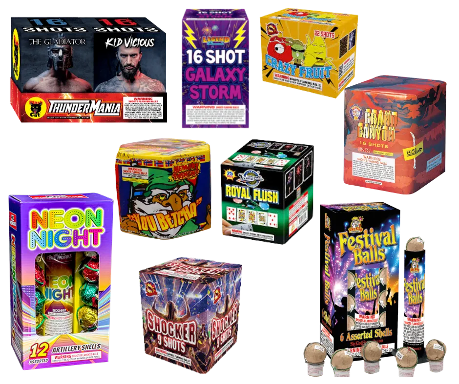 Neon Night Artillery, Festival Balls Artillery, Noisy Flashy 200gr, Royal Flush 200gr, You Betcha 200gr, Headbanger 200gr, Grand Canyon 200gr, Galaxy Storm 200gr, Crazy Fruit 200gr, Shocker 200gr, Thunder Maina 200gr